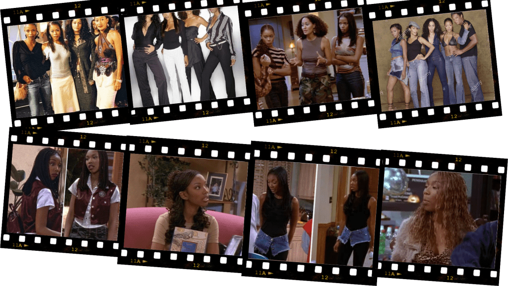 Starting off with the OG IT girls Moesha and the Girlfriends. From the microbraids to the low waist flares, Moesha provided us with endless outfit inspo – constantly serving 90s teen chic. One thing I loved about Moesha is that it helped many black girls to celebrate protective styles, their flexibility and the way they are in fact fashionable mainstream media.